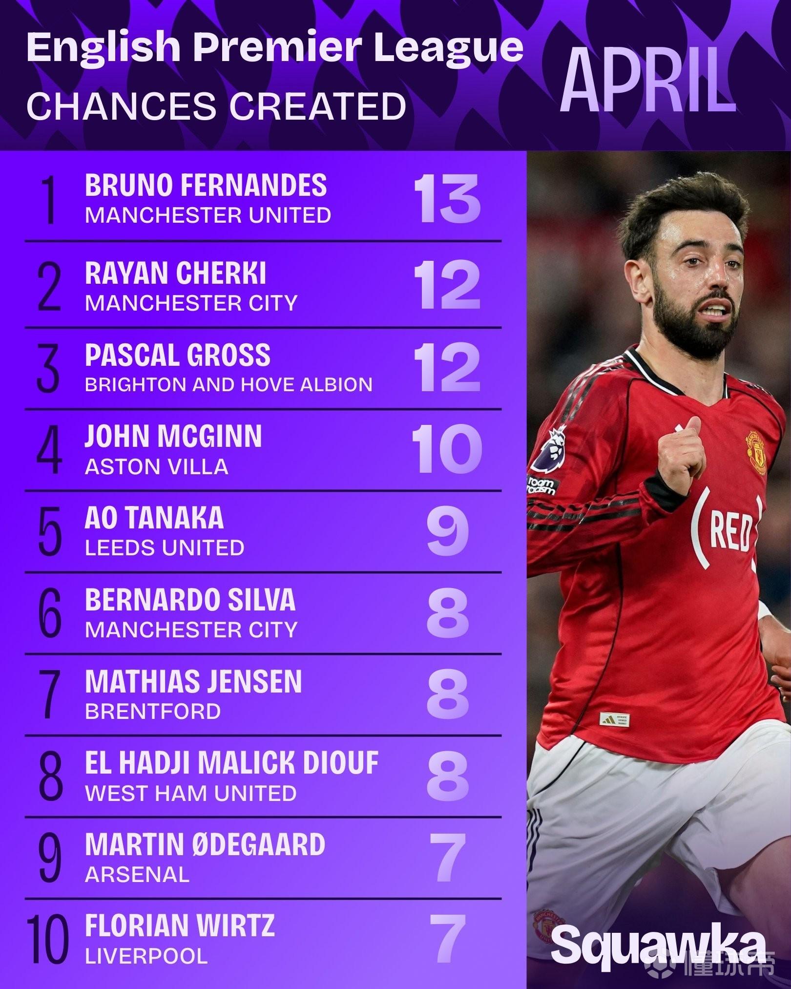 英超4月创造机会榜:B费13次第一,谢尔基、格罗斯12次第二