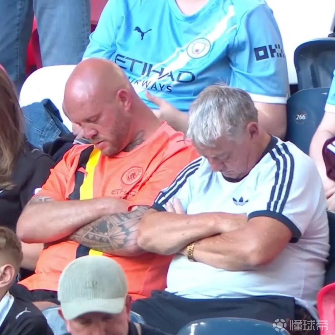 在曼城vs南安普顿的足总杯半决赛中,多名双方球迷被拍到在看台上睡觉。