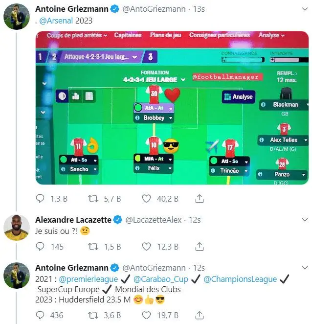 一件趣事是2019年格列兹曼玩FM的时候,用阿森纳开档,把挚友拉卡泽特卖了,然后带队勇夺欧冠,拉卡泽特“很伤心”,两人在社交媒体上也很愉快的互动。