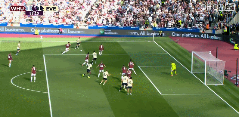 第88分钟,霍尔抽射破门!埃弗顿1-1扳平,西汉姆联实时排名跌入降级区