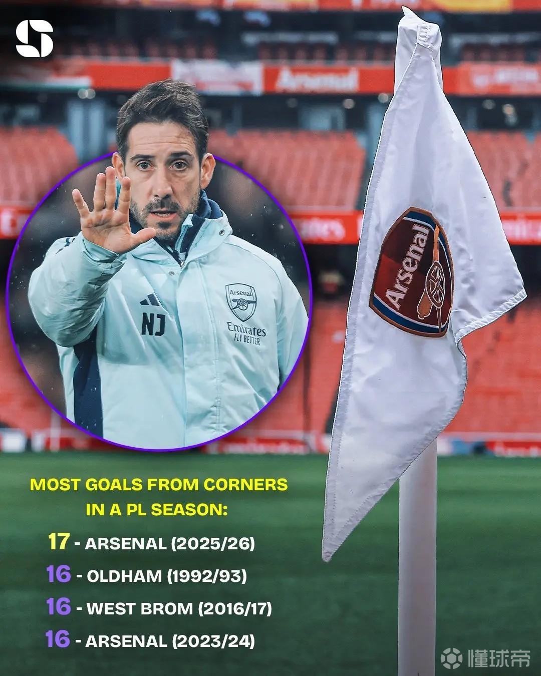 本赛季英超阿森纳已通过角球打入17球,创造英超新的历史纪录