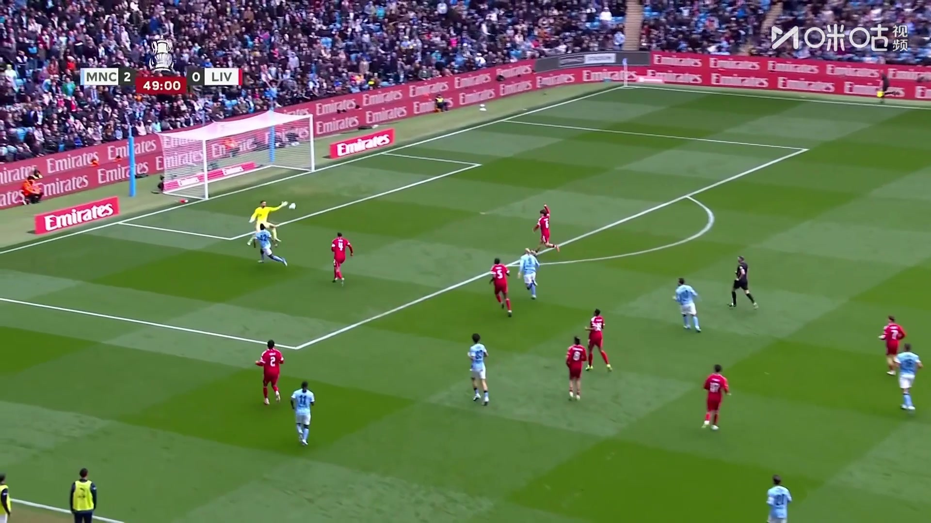 哈兰德头球破门上演梅开二度曼城2-0领先利物浦