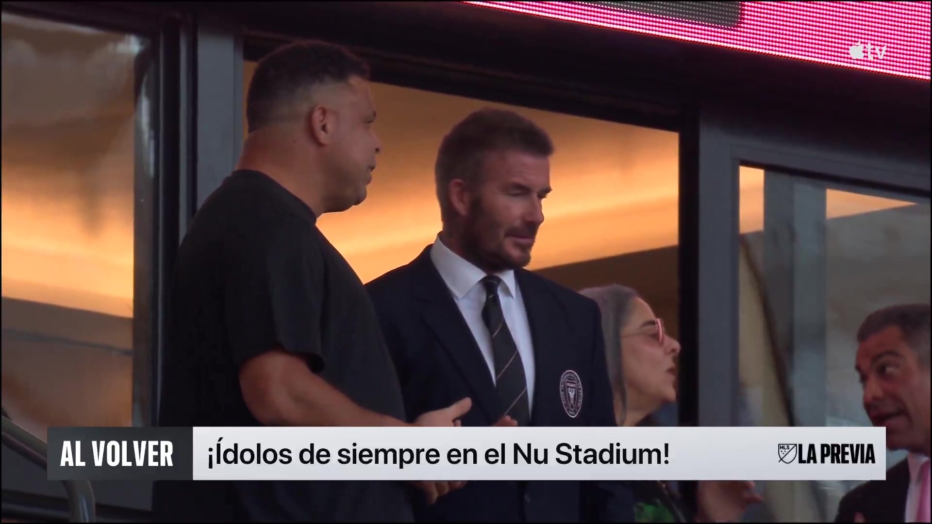 两位巨星罗纳尔多和贝克汉姆一起在新球场观看梅西的首秀