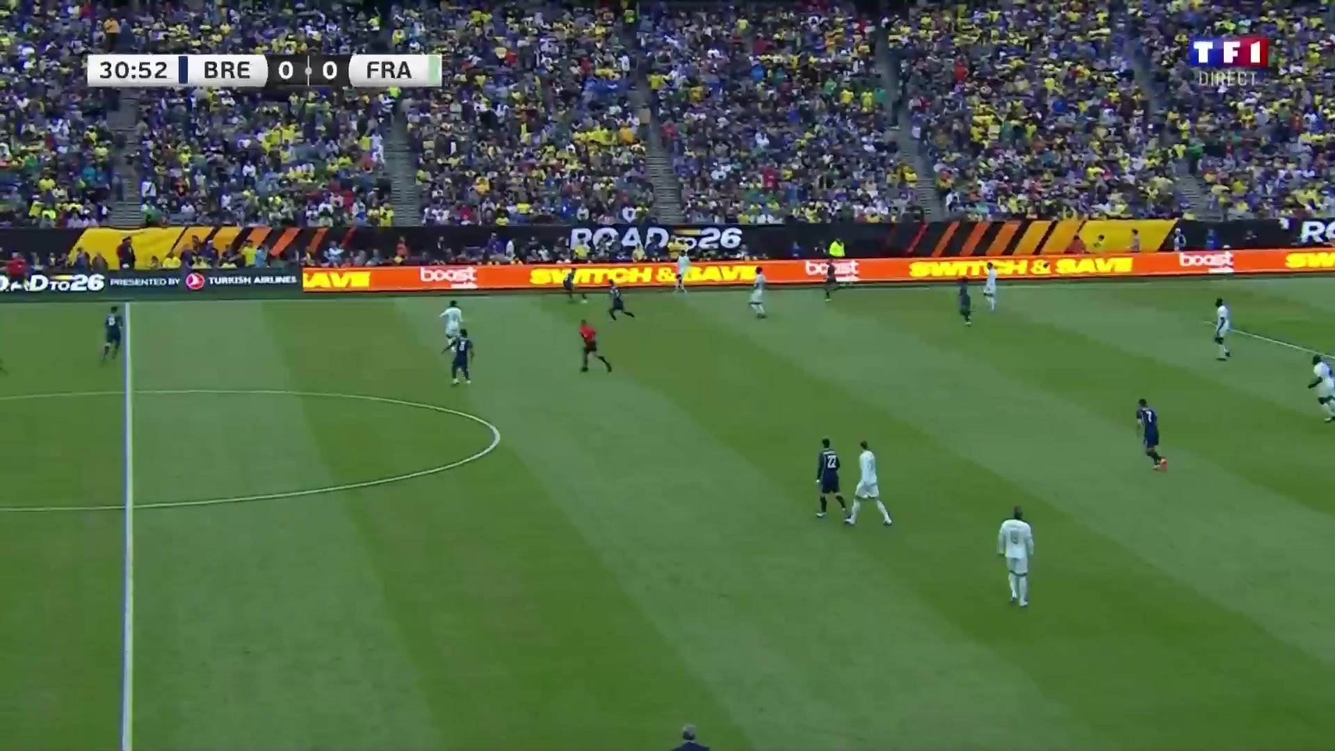法国1-0领先巴西登贝莱直塞姆巴佩单刀挑射破门