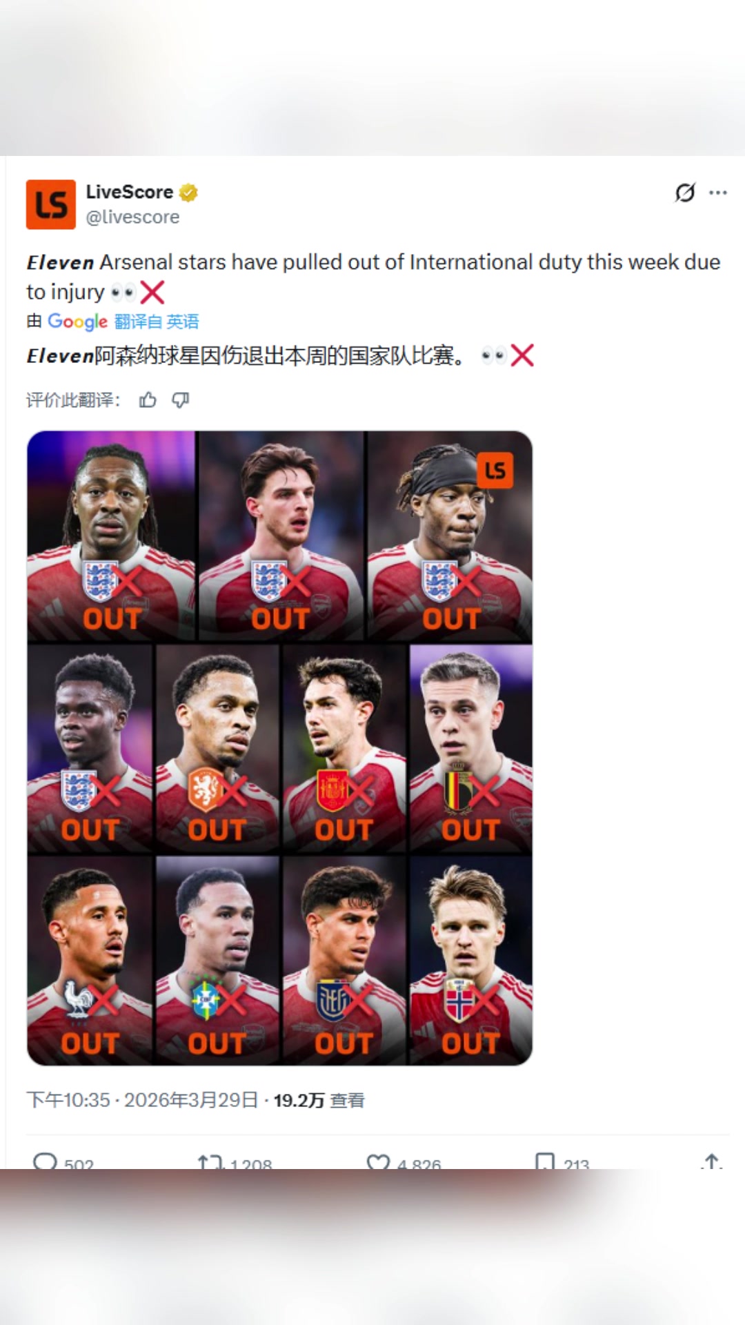 天塌了阿森纳众多球员因伤退出本周的国家队比赛