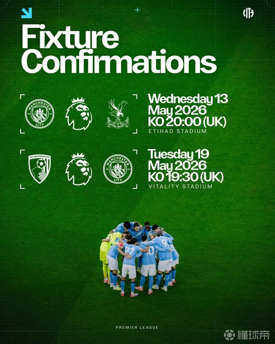 官方:英超第37轮及曼城vs水晶宫补赛开球时间确定
